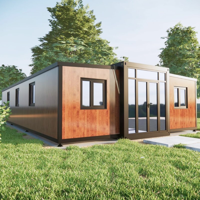 Luxury Exterior - Our prefabricated container house designed of black steel frame with dark wood grained galvanized steel exterior panels, and light wood grained interior PVC flooring. The tiny home creating a style closer to the natural countryside of a small villa. Bring you a better living experience in peace.