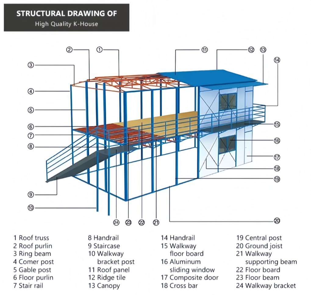 (1) TOPINDUS K Type Prefab House is of thin walled light steel structure, which meets the building structural standard requirements ( waterproof and anti-corrosive)