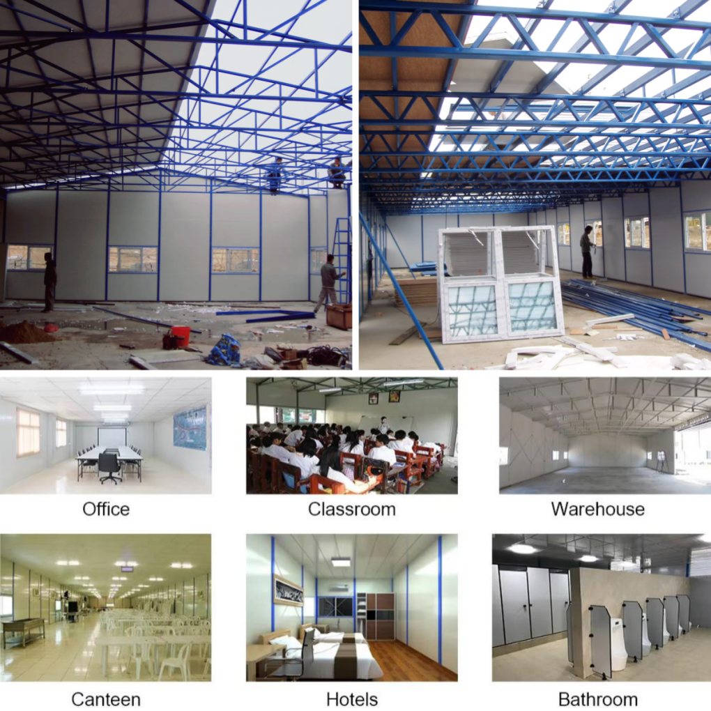 Cheap light steel structure prefabricated house is widely using in the different industry: the temporary house for road, railway and building site,etc. Also can be as temporary office, meeting room, headquarters, public accommodation and temporary store , school, hospital, parking lots, show rooms, electric house, repairing shop, gasstation etc.